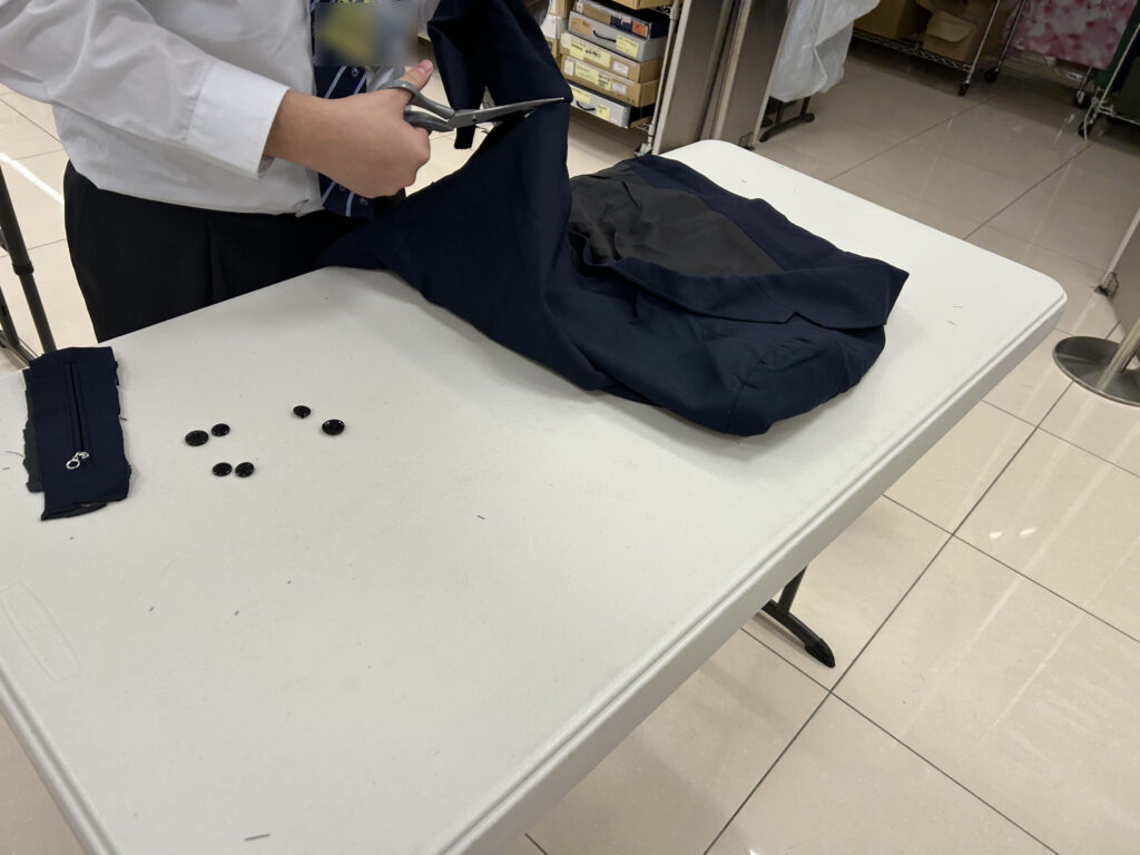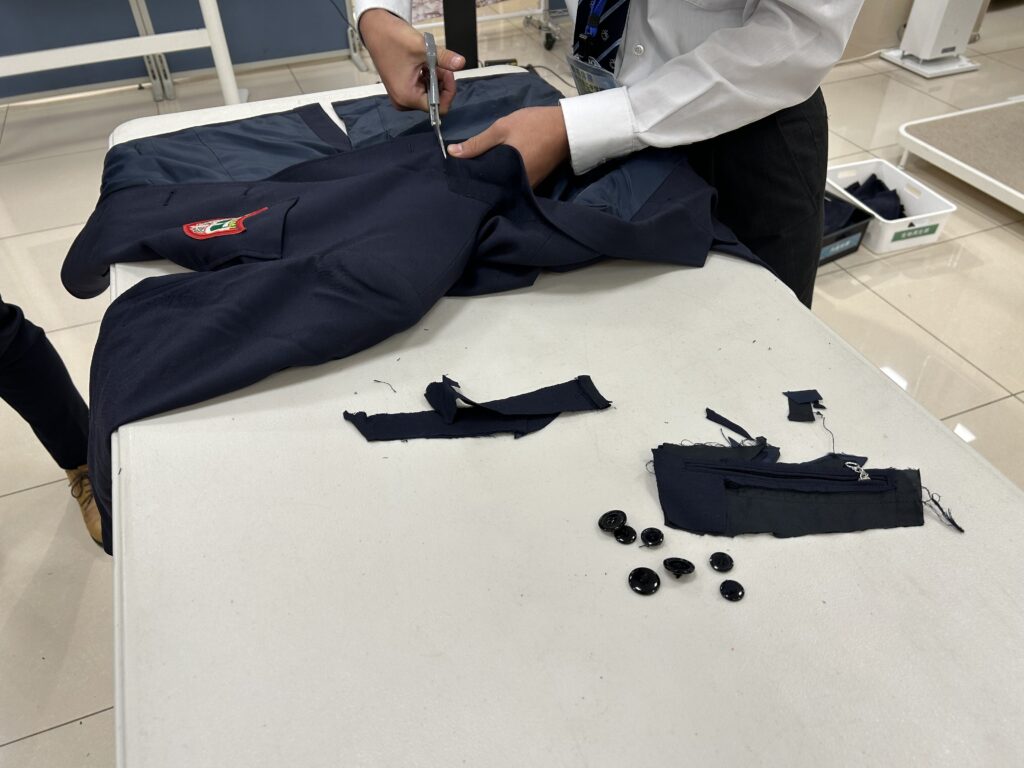 学生服のアップサイクルについての総合学習と学生服の裁断体験をしていただきました。